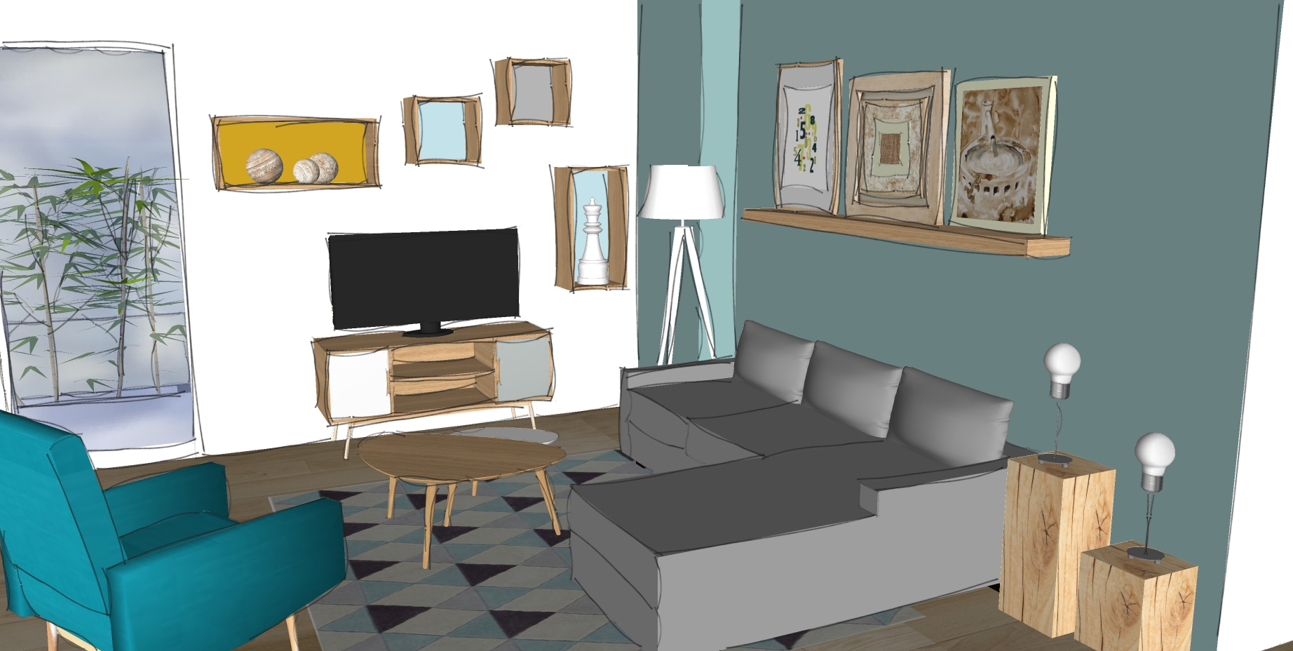 Prestation réalisée : book décoration personnalisé avec plans d’agencement, croquis, préconisations couleurs, mobilier et matériaux